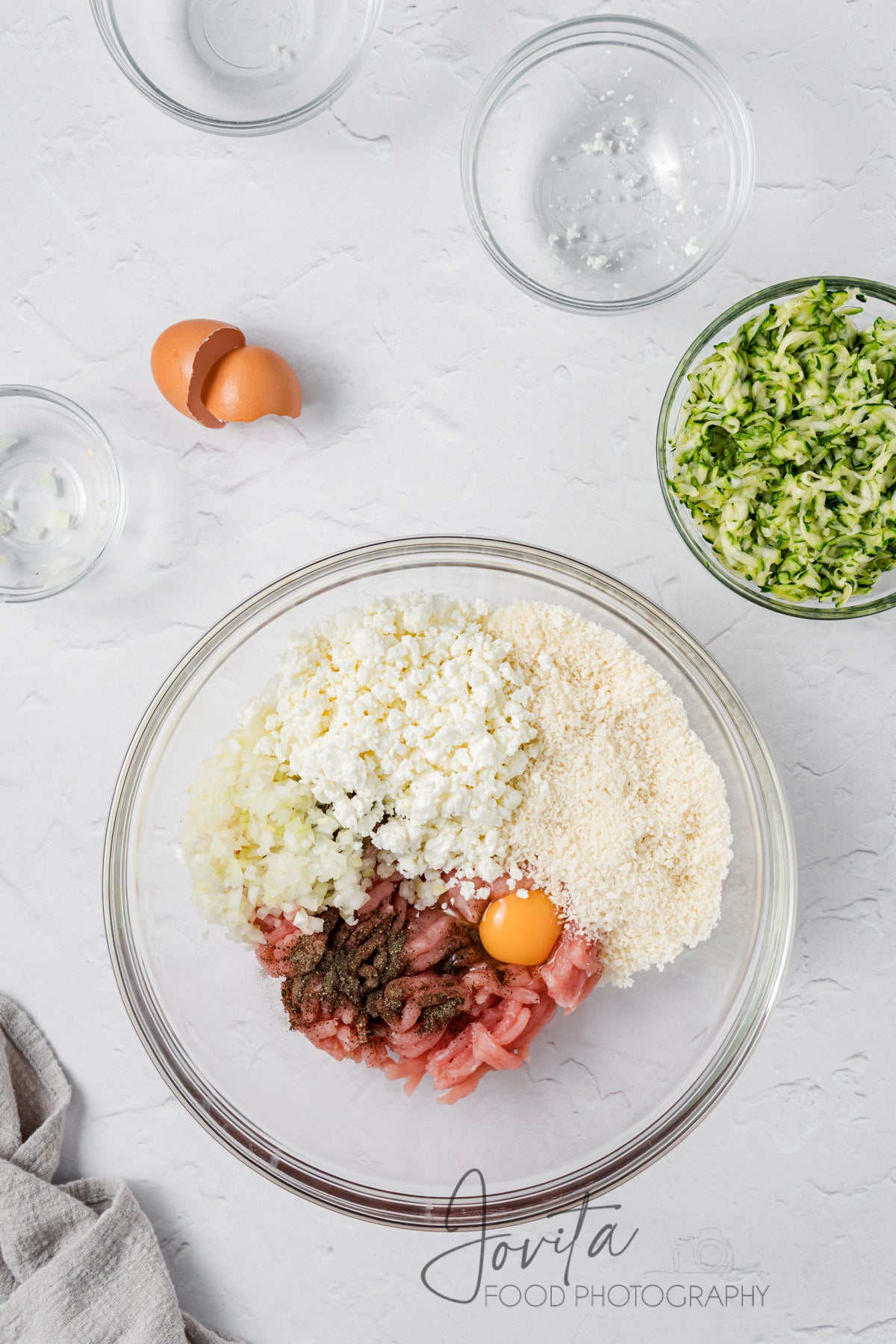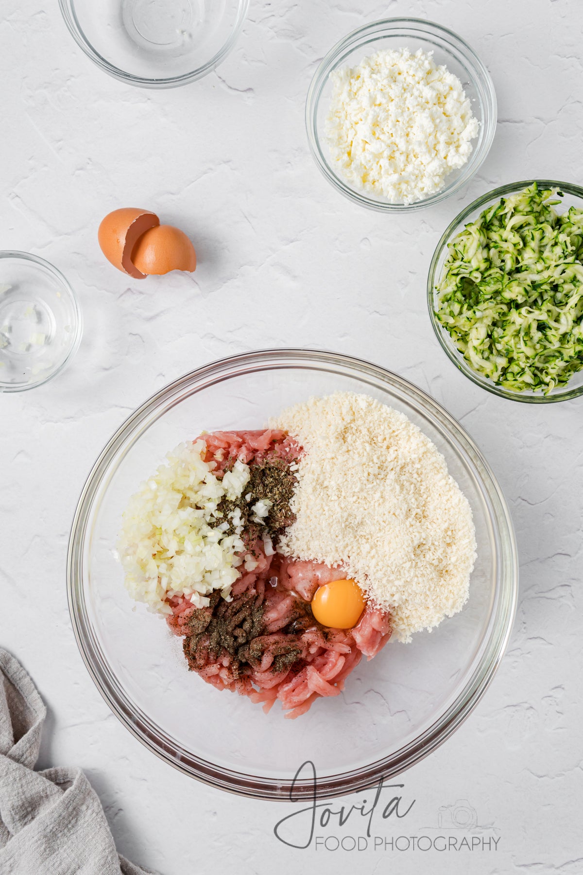 Featured ingredients: zucchini, ground turkey, feta, onion, garlic, breadcrumbs, egg, dried basil, marinara (optional).