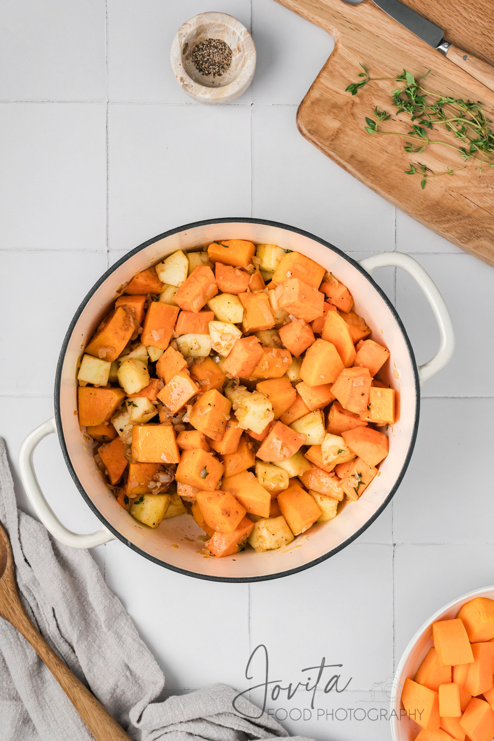 Featured ingredients: olive oil, onion, garlic, fresh ginger, butternut squash, sweet potato, Granny Smith apples, cinnamon, ground nutmeg, cayenne pepper, fresh thyme, vegetable broth, coconut milk, apple cider vinegar.
