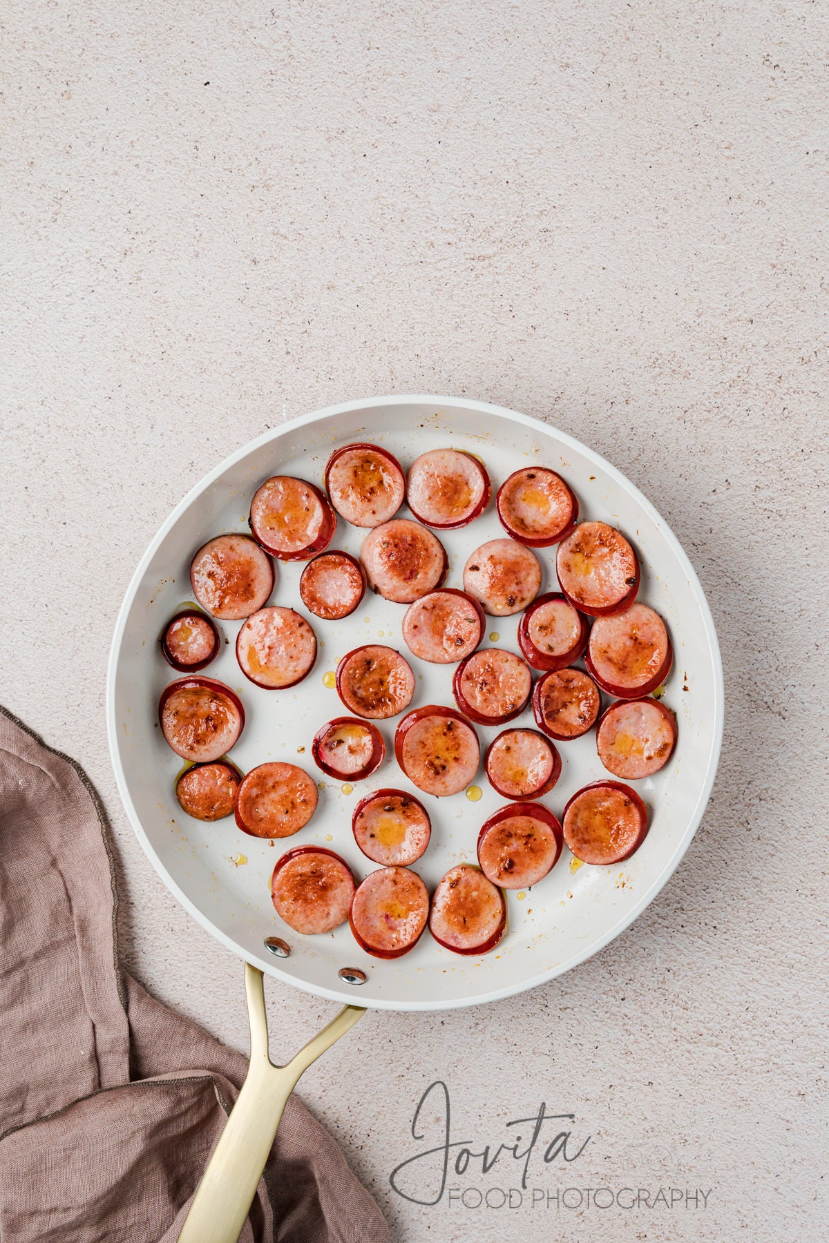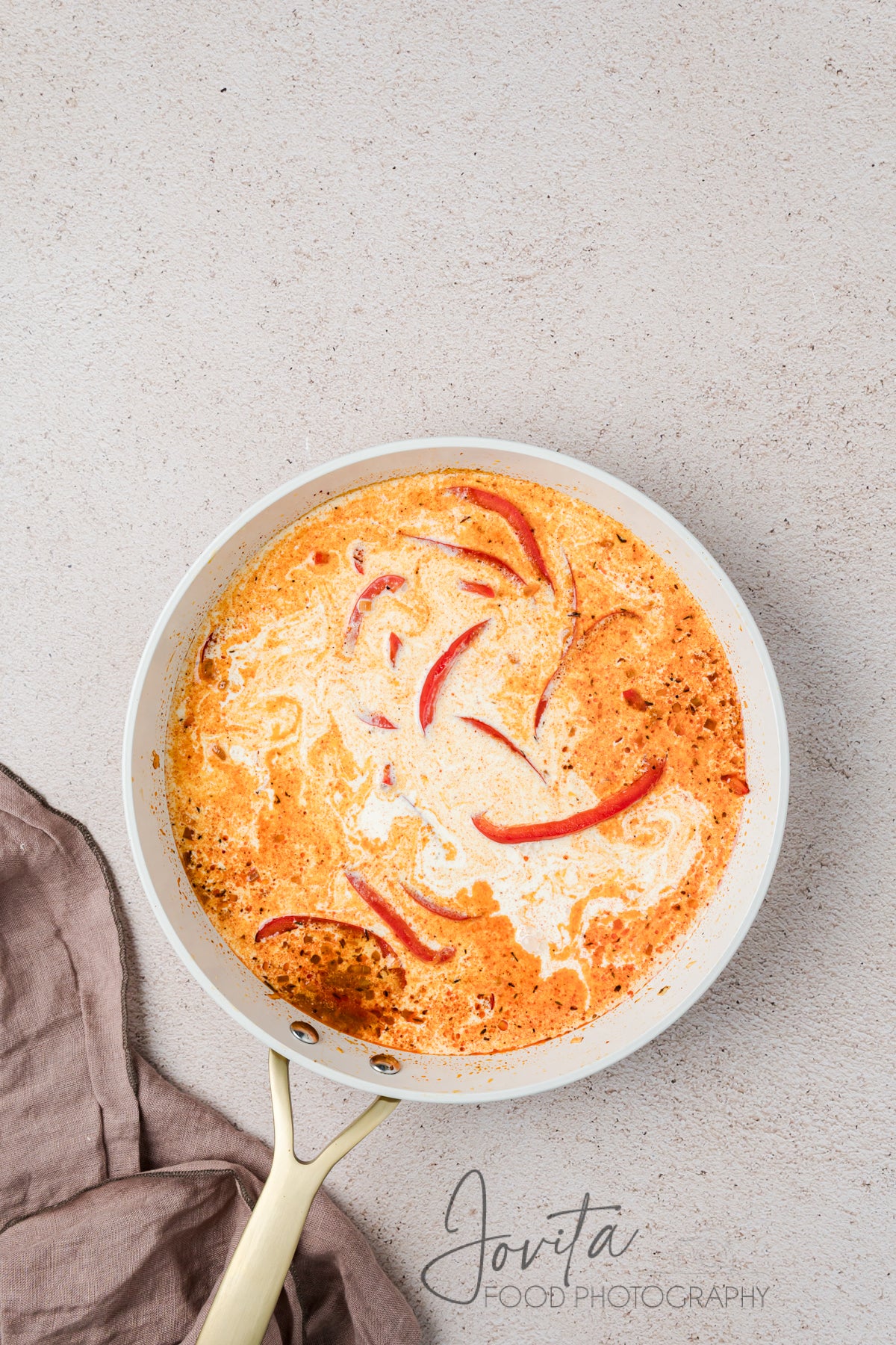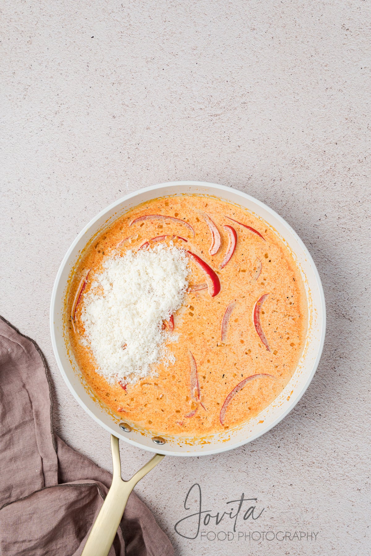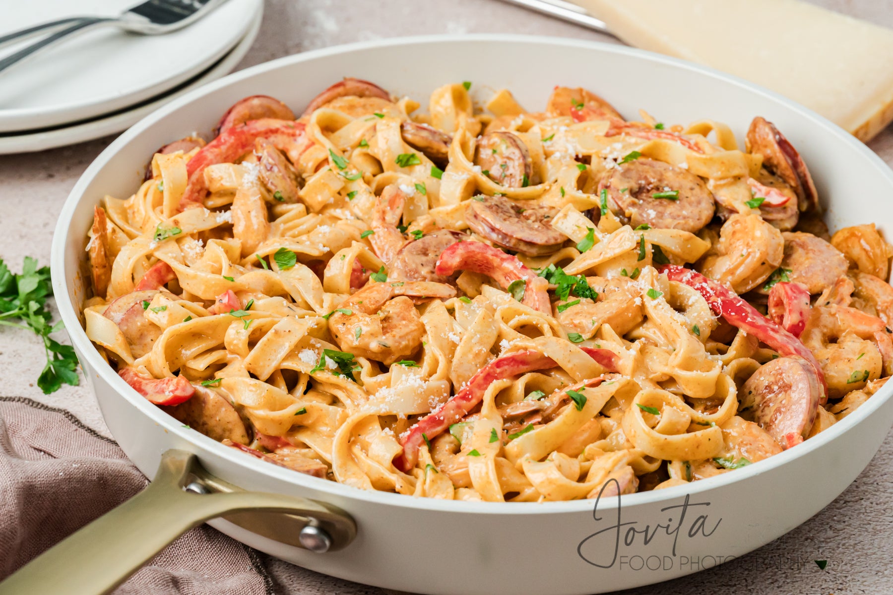 Featured ingredients: pasta, shrimp, Cajun seasoning, olive oil, smoked sausage, onion, bell pepper, garlic, smoked paprika, broth, Worcestershire sauce, heavy cream, Parmesan.