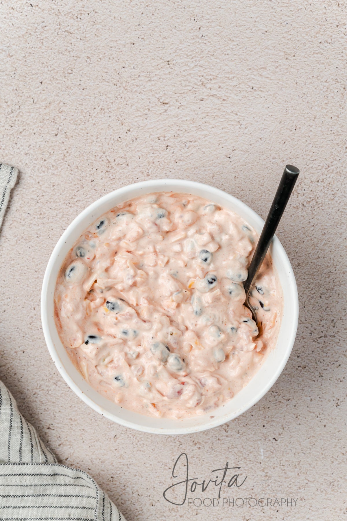 Featured ingredients: chicken breasts, olive oil, fajita seasonig mix, onion, bell peppers, garlic, sour cream, salsa, Mexican cheese blend, black beans.