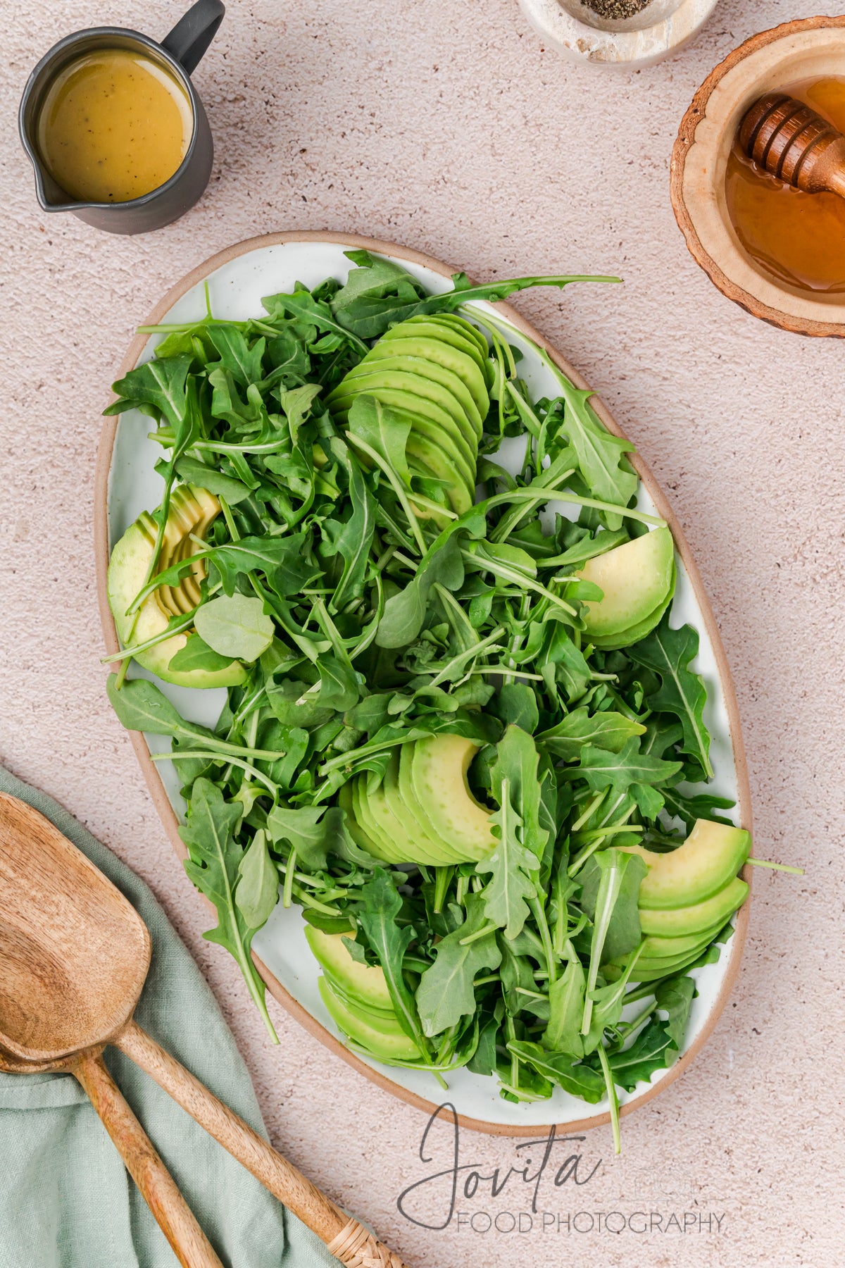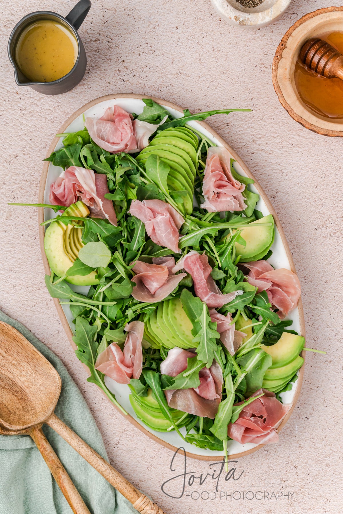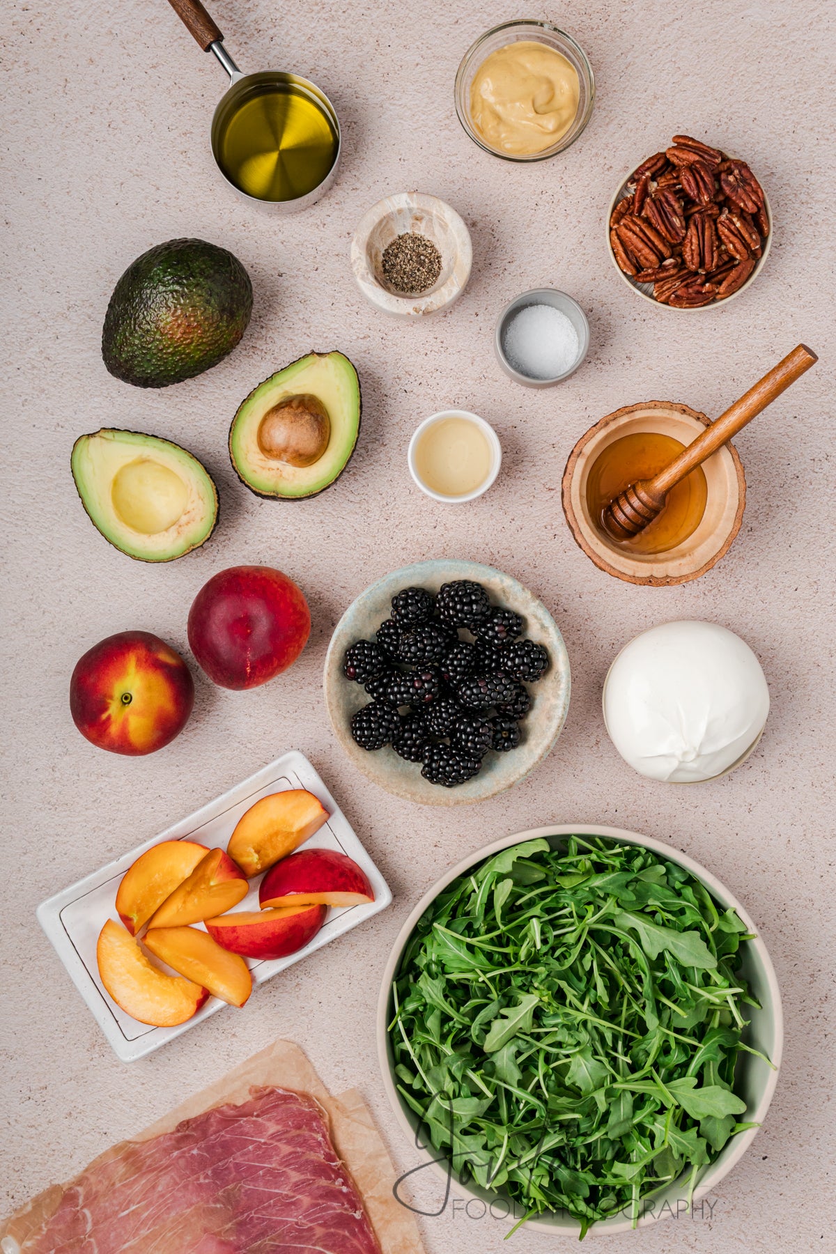 Featured ingredients: peaches, olive oil, honey, arugula, avocado, prosciutto, blackberries, pecans, burrata, apple cider vinegar, Dijon.