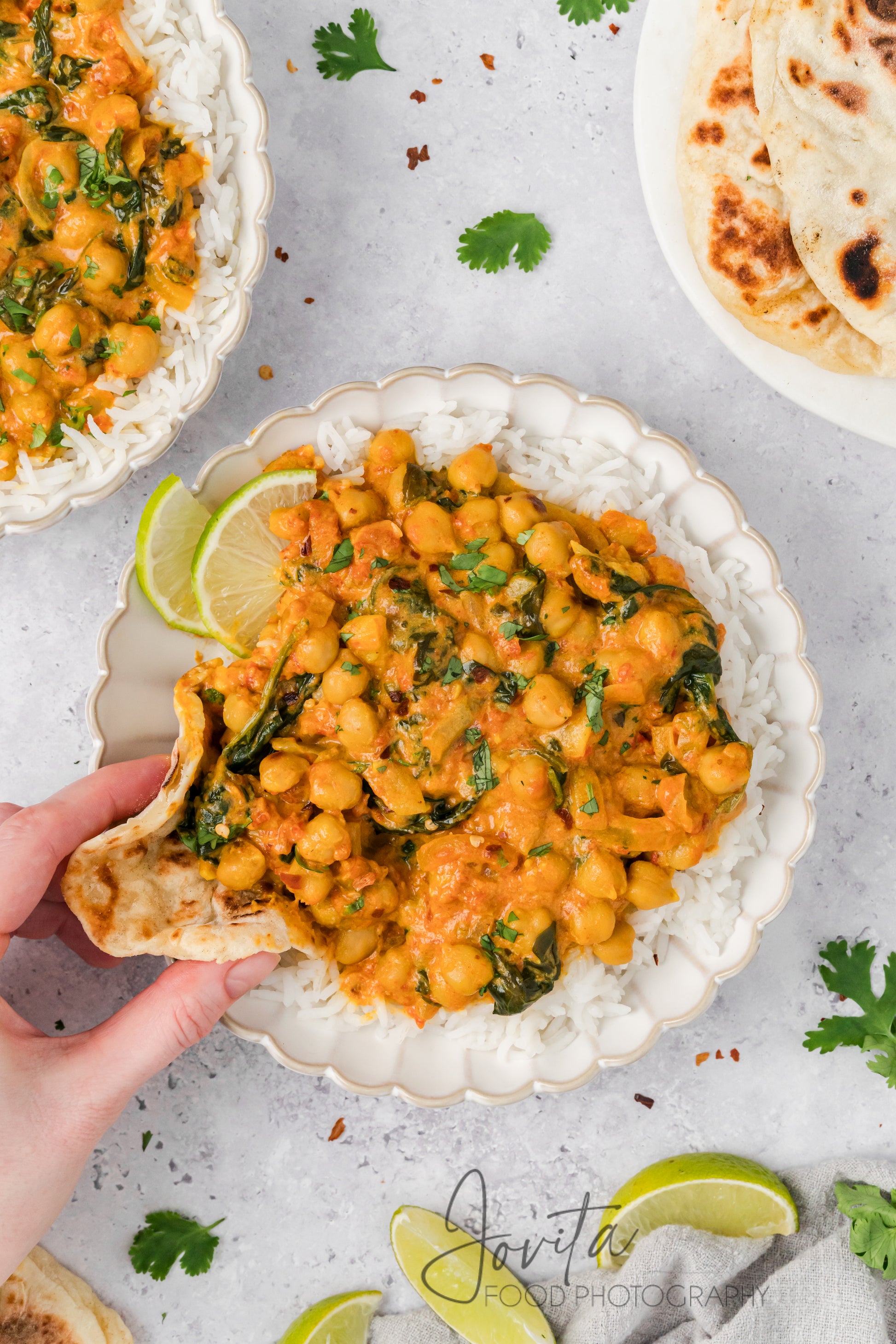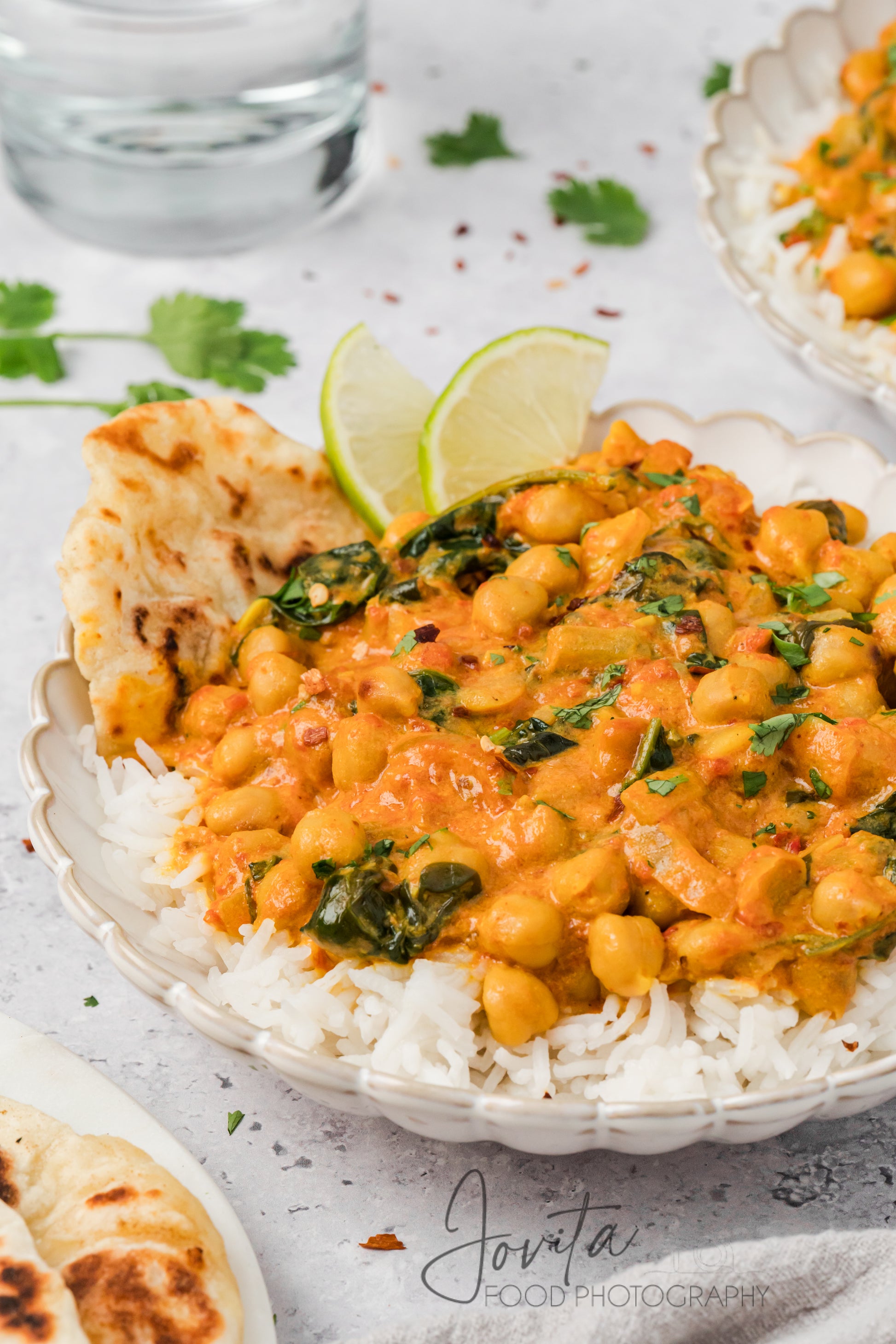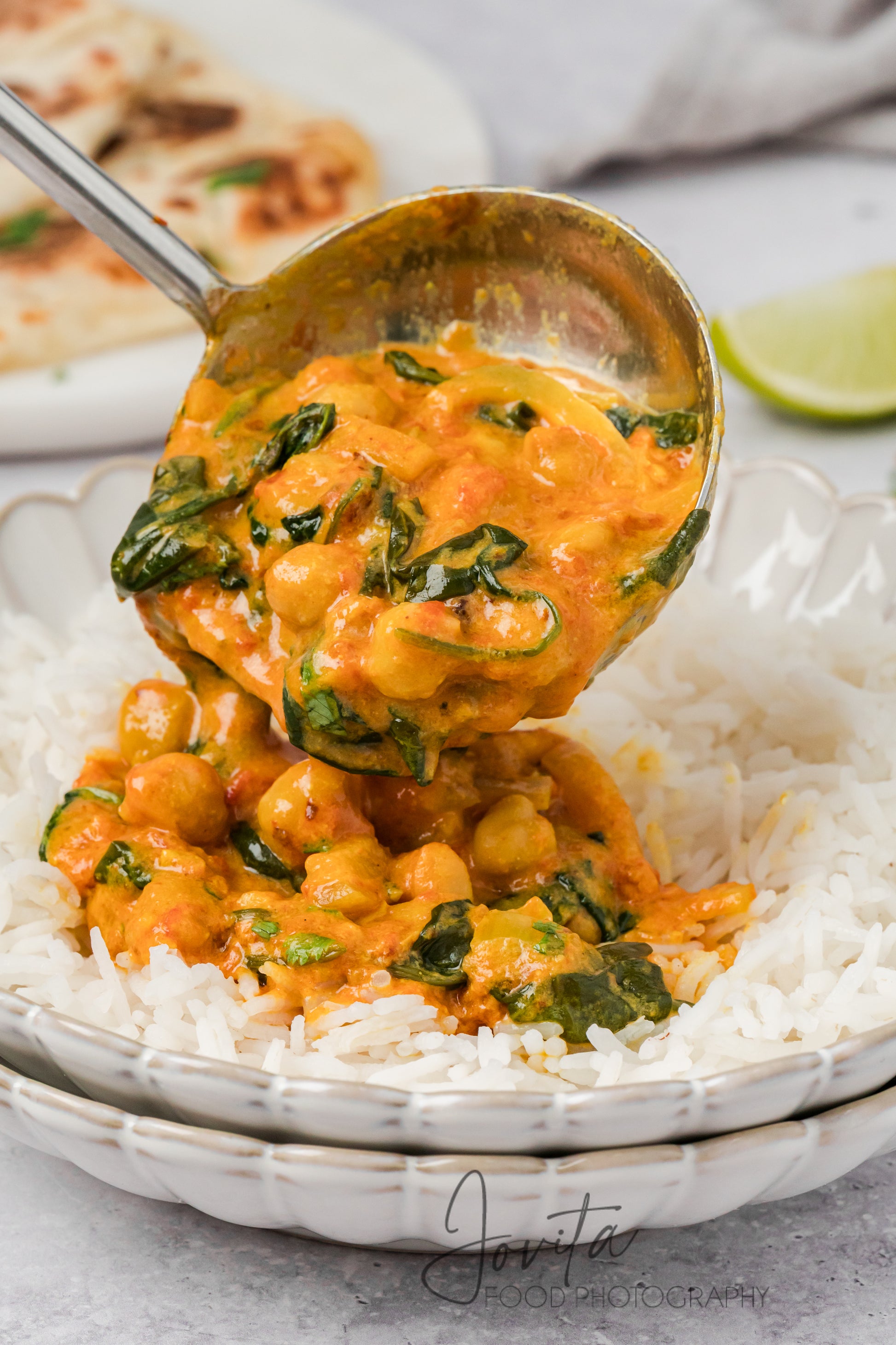 Featured ingredients: olive oil, onion, garlic, fresh ginger, curry powder, ground turmeric, red pepper flakes, coconut milk, canned tomatoes, canned chickpeas, spinach, lime juice.