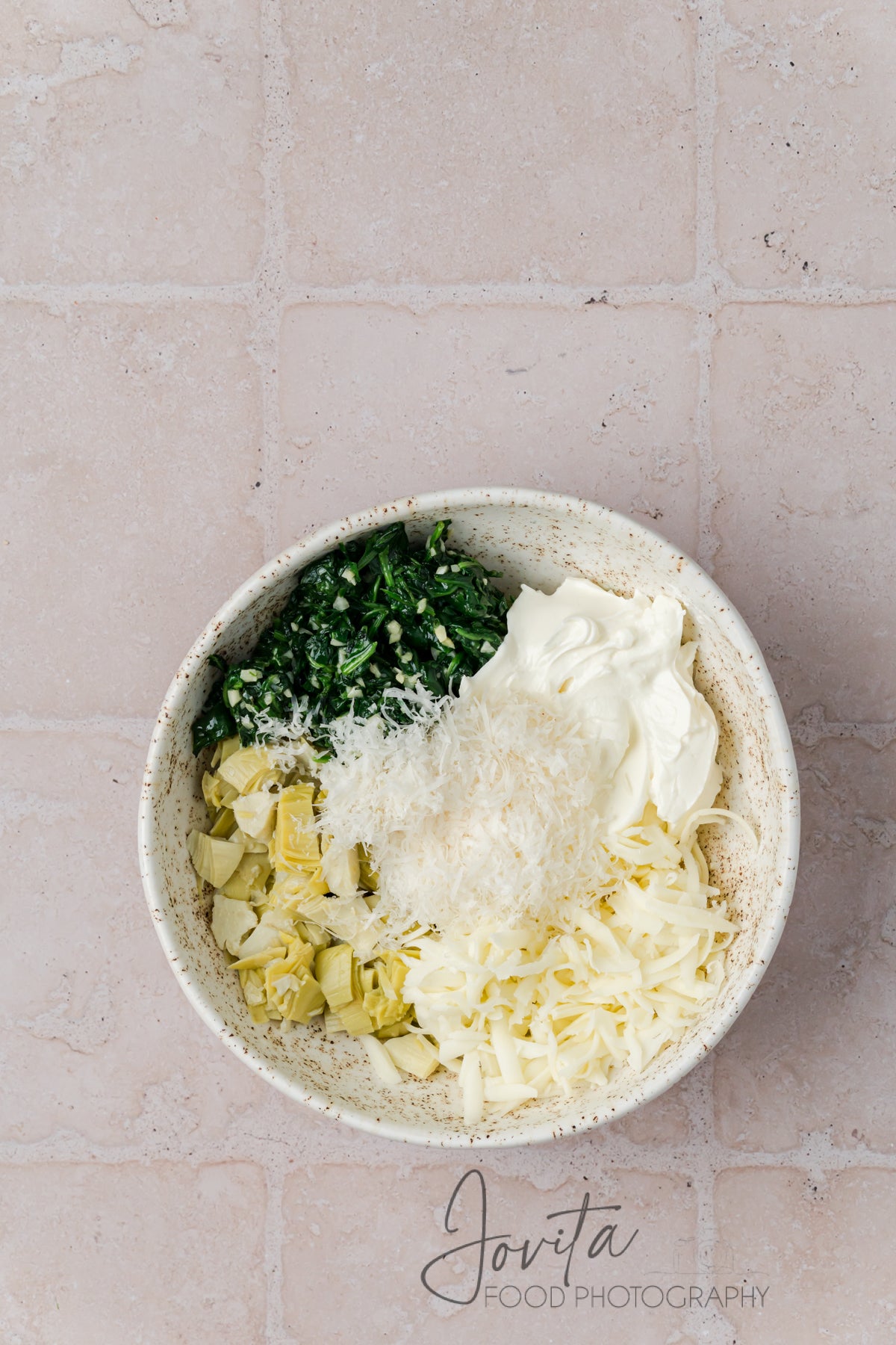 Featured ingredients: chicken breasts, garlic powder, paprika, Italian seasoning, olive oil, garlic, spinach, canned artichoke hearts, cream cheese, mozzarella, Parmesan.