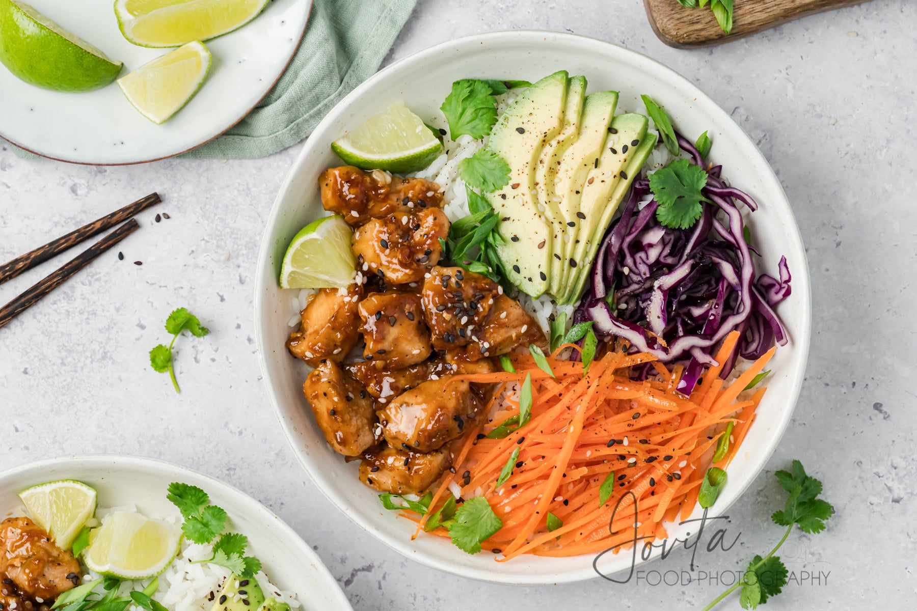 Featured ingredients: chicken breast, olive oil, garlic, fresh ginger, soy sauce, rice vinegar, brown sugar, honey, toasted sesame oil, cornstarch, rice, carrot, red cabbage, avocado, green onions, sesame seeds, cilantro, lime.